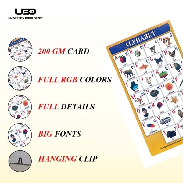 This Alphabet Wall Chart features both small and capital letters in a clear and easy-to-read format. Printed on a 200-gram laminated card, it is durable and long-lasting. With a size of 23×36 inches, it provides a perfect learning aid for classrooms, schools, and study areas. The hanging loops make it easy to display, helping kids recognize and memorize letters effectively.