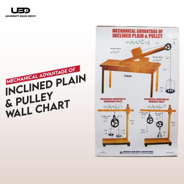This informative wall chart provides a detailed explanation of the inclined plane and pulley system, illustrated with HD-quality visuals for enhanced learning. Perfect for school and classroom decoration, it is printed on a 200-gram laminated card for durability. Measuring 23×36 inches, the chart is equipped with steel edges and hanging loops for a secure and professional display. It simplifies mechanical concepts, making it an essential resource for physics education.