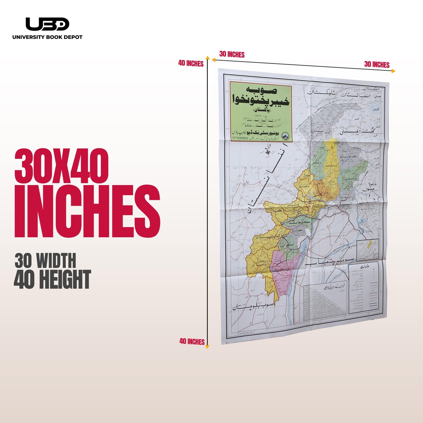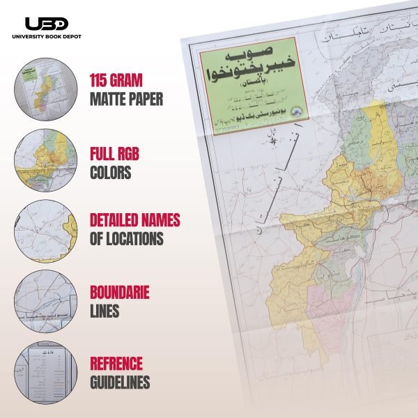 This detailed map of Khyber Pakhtunkhwa, printed in Urdu, offers clear and accurate geographical details of the region. Measuring 30×40 inches, it is printed in HD quality on durable matte paper. Ideal for use in schools, offices, and public places, this map highlights important cities, landmarks, and boundaries, providing a comprehensive guide to the province.