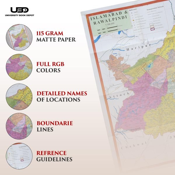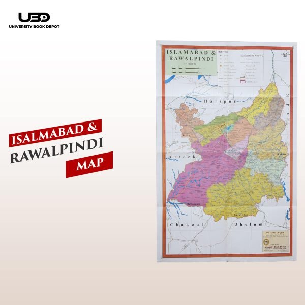 This HD-quality map features the cities of Rawalpindi and Islamabad, offering clear and detailed visuals. Printed on 115-gram matte paper and measuring 23×36 inches, the map is perfect for offices, public places, and tour guides. It highlights important locations such as airports, hospitals, parks, and boundary lines, making it an invaluable reference tool for navigating the cities.